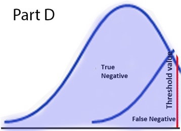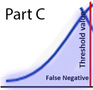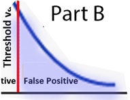 Using a stricter threshold for test positivity is represented as sliding the vertical red bar to the right on the 2nd diagram. This alters the Sensitivity and 1-Specificity in the following way, explaining how a stricter threshold is represented as a coordinate along the bottom left of the curve B on the Sens/Spec curve.