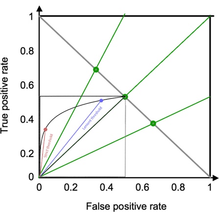 Now that the region of utility is declared, it must be determined whether a diagnostic test can perform adequately within that region, and what threshold gives optimal performance. Any portion of its ROC curve that resides within the region of utility satisfies the LR+ and LR- slope requirements. Some test may have no portion in the region despite having a better performance characteristic overall. Within this portion, one must determine which point is closest to the top left corner, (X, Y) = (0, 1). The precise derivation depends on the exact shape of the ROC curve.