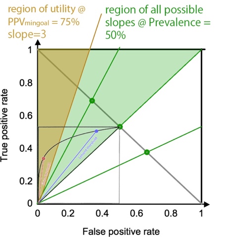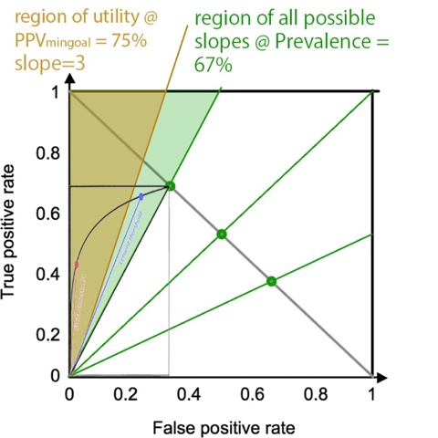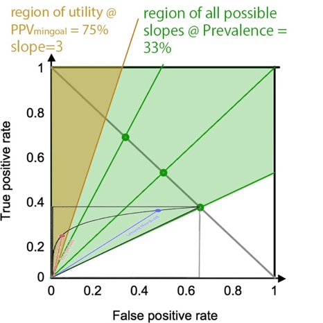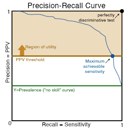 The precision-recall curve is another way to visualize the PPV-to-Sensitivity tradeoff when setting a PPVmingoal. Namely, the region of utility is above the horizontal line defined by Y=PPVmingoal, restricting X to its lower end. Just like in the TP/FP ROC discussion, a PPVmingoal below the Prevalence of one’s target population is nonsensical because all (X,Y) are necessarily above Y=Prevalence. One should then feel free to select the globally optimal point closest to (X,Y) = (1,1).